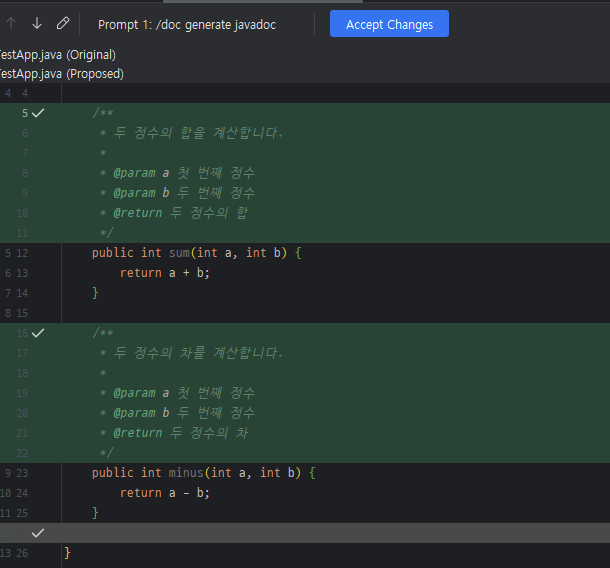제안내용이 괜찮으면 Accept Changes를 클릭하여 즉시 나의 코드에 반영할 수 있다.