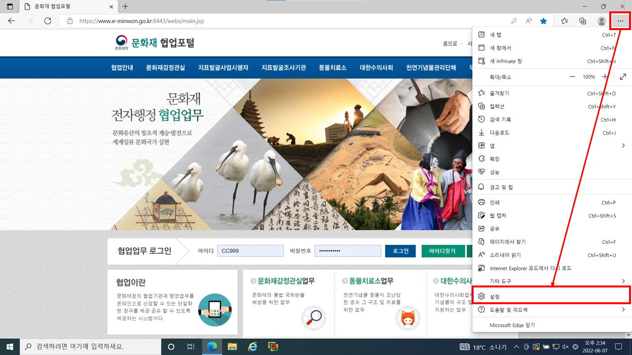 문화재 협업포털 사용할 때마다 “Internet Explorer 모드에서 다시 로드” 단계를 꼭 진행해주세요.
