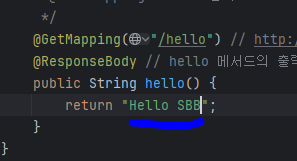 @ResponseBody // hello 메서드의 출력 결과가 문자열 그 자체임을 나타냄.(출력결과는 이런 String 문자열 보다, html 파일과 같은 템플릿이 주로 사용)