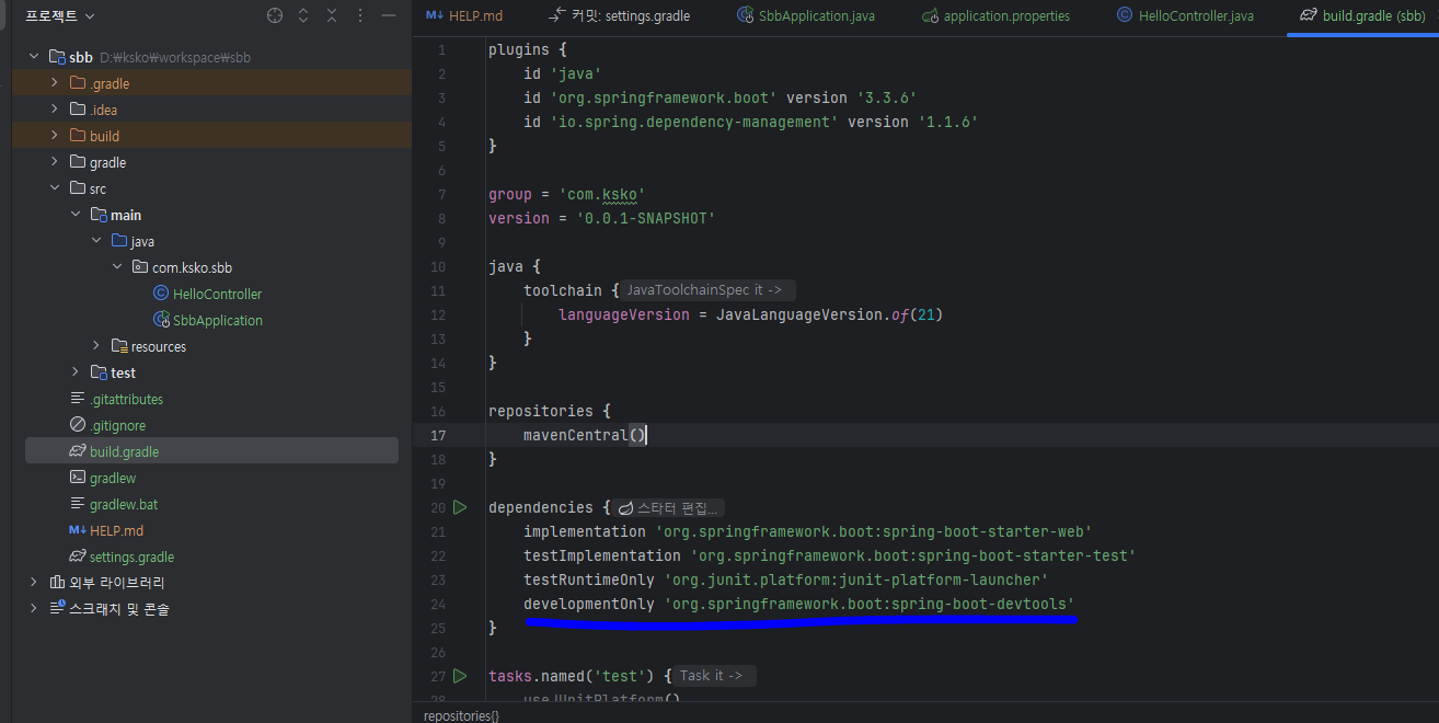 모든 프로그램에는 프로그램의 시작을 담당하는 파일이 있다. 스프링 부트로 만든 프로그램(=스프링 부트 애플리케이션)에도 시작을 담당하는 파일이 있는데. 그 파일이 바로 "프로젝트명 + Application.java" 파일이다. 스프링 부트 프로젝트를 생성할 때 프로젝트 명으로 'sbb' 라는 이름을 입력하면, 다음과 같이 SbbApplication.java 파일이 자동으로 생성된다.