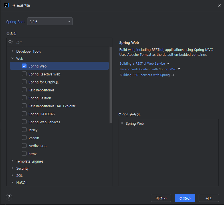스프링 부트 버전은 3.3.6, 의존성은 Web --> Spring Web 선택 후 생성 버튼 클릭
