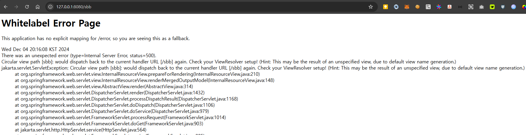 로컬 서버 구동 후 http://localhost:8080/sbb 페이지 요청하자