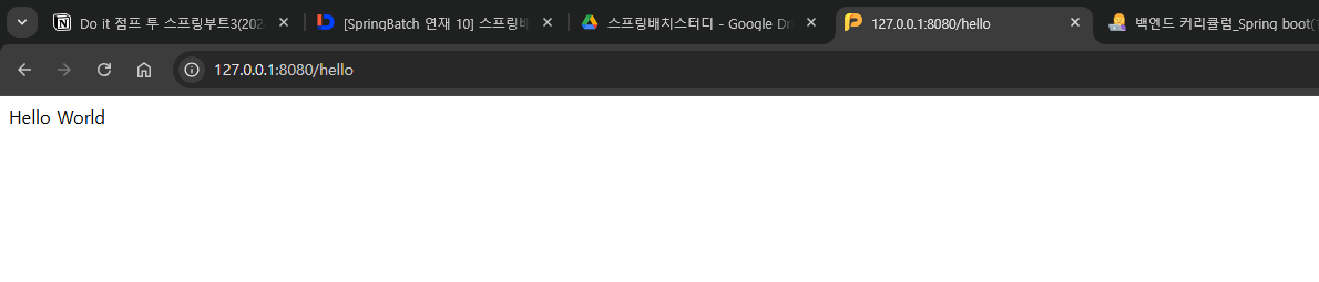 리턴 문자값을 변경하고 URL 붙어도 Hello World로 나온다. 그 이유는 프로그램이 변경되어도, 별도의 과정 없이는 로컬 서버가 변경된 클래스를 즉시 반영하지 않기 때문이다.