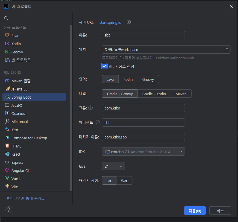 프로젝트 --> 프로젝트 생성 --> 아래 정보로 입력 --> 다음 클릭