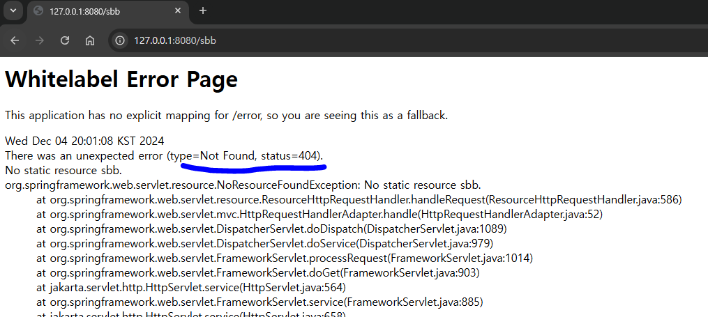 이 오류를 해결하려면? --> /sbb URL에 대한 매핑을 추가하면 해결할 수 있음.