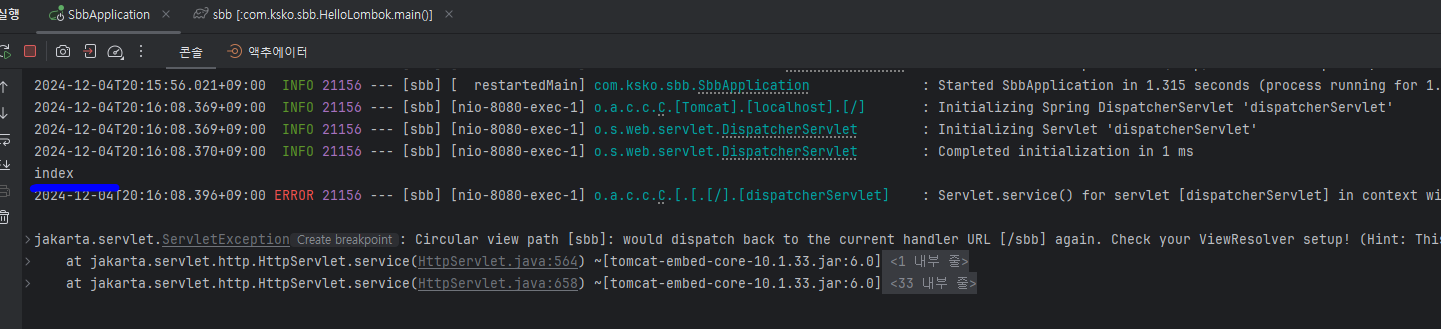 http://localhost:8080/sbb 요청 --> MainController 클래스의 index 메서드가 호출되긴 했지만, 오류 발생
